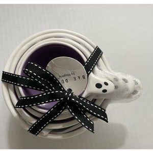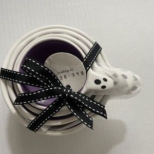 New in original packaging, this Rae Dunn measuring cup set is white on the outside and purple on the inside. The handles feature a spoopy ghost.