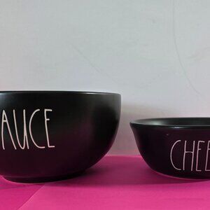 The Rae Dunn Artisan Collection black with white lettering sauce and cheese bowl set #181. The SAUCE bowl is 3" in height and the CHEESE bowl is 2" in height.