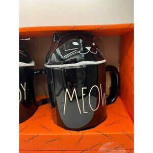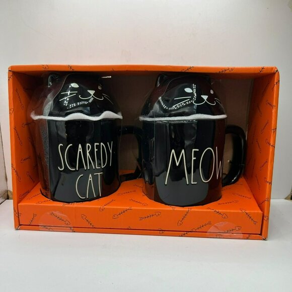 This Rae Dunn Artisan Collection features unique Halloween-themed 'SCAREDY CAT' and 'MEOW' ceramic coffee mugs. Comes as a set of 2 with lids, brand new in box.