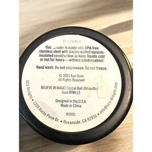 Discover the enchantment of everyday moments with the Rae Dunn "Believe in Magic" tumbler. This sleek black travel companion, crafted from BPA-free stainless steel, features double-walled vacuum insulation to keep your favorite beverages hot or cold for hours. With a 17 oz capacity, it's perfect for morning commutes, weekend getaways, or cozy evenings at home. Its stylish design makes it a delightful accessory for any occasion. Hand wash only. This tumbler is pre-owned, adding a touch of history to its charm. Type: Tumbler Brand: Rae Dunn Color: Black Material: BPA-free Stainless Steel Features: Double-walled vacuum insulation, Keeps beverages hot or cold, Stylish design, Hand wash only Capacity: 17 oz Country of origin: China Care instructions: Hand Wash Only
