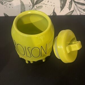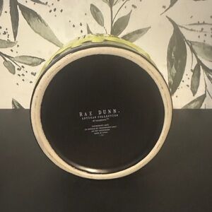Stylish black jar with green accents. Features Rae Dunn's signature design.