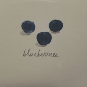 This plate features three blueberries with "blueberries" written in cursive underneath them