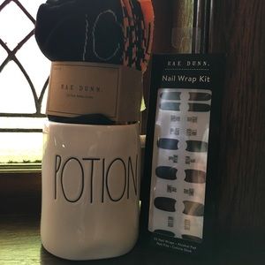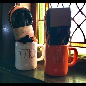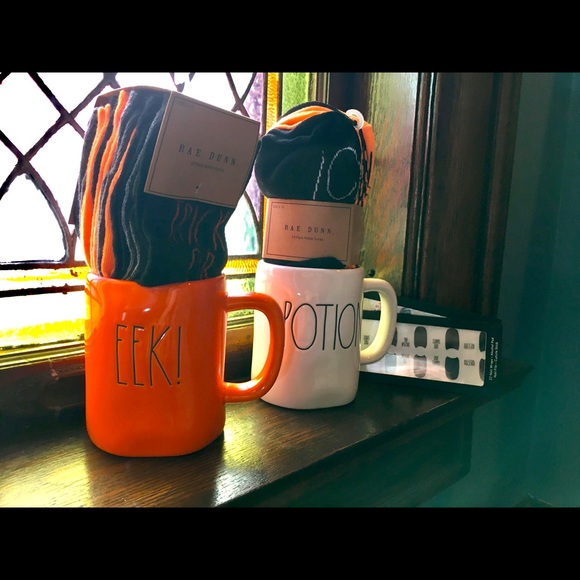 Brand new Rae Dunn Halloween bundle. Two mugs. Two sets of Halloween socks.(10 pairs each) Two sets of black and clear nail stick ons.