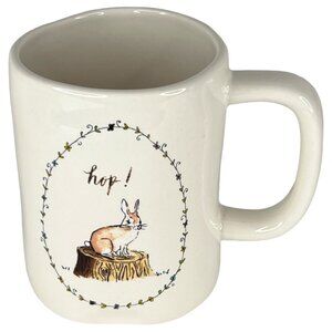 This Rae Dunn ceramic mug from the Artisan Collection features a charming bunny illustration with the word "hop". Its 14 oz capacity is suitable for hot beverages. The white ceramic design adds a touch of elegance to your drinkware collection. Dishwasher safe for added convenience.