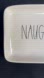 Platter is creamy white. NAUGHTY & NICE is written in black large long letters ll.
