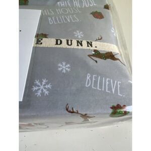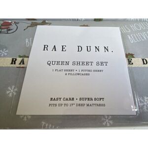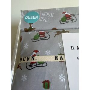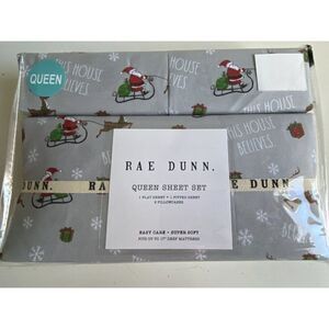 Rae Dunn Christmas Santa Claus Sleigh Reindeer Snowflakes QUEEN SIZE Soft Sheet Set Grey NEW