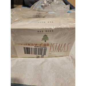This listing is for two new, unopened bars of Rae Dunn soap. One bar is labeled "Frosted Pine" and features a red and white design with Santa Claus and Christmas trees. The other bar is labeled "Merry Christmas" and features a white design with a Christmas tree. Both bars are 8 oz and are packaged in plastic wrap with tags. The soap is scented with shea butter. The items are in new condition with tags and box.