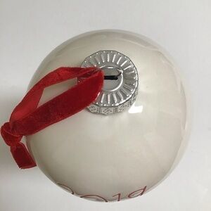 Round white, thick ceramic ornament measures approx. 4 1/2” in diameter and has a 3” red velvet hanging ribbon loop. Quality made.