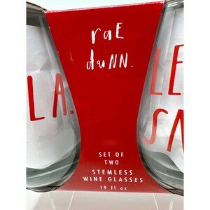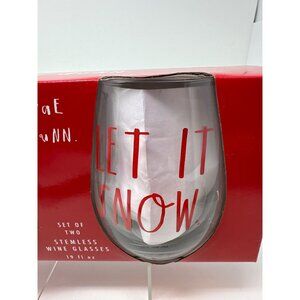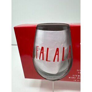 Celebrate holiday cheer with these Rae Dunn stemless wine glasses. Each glass holds 19 ounces and features festive slogans: 'FAL A LA' and 'Let It Snow'. Perfect for Christmas gatherings or as a gift.