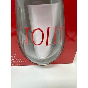 Set of 2 Rae Dunn stemless wine glasses with "Cheer" and "Jolly" inscribed in red. Ideal for Christmas and New Year celebrations. Each glass holds 19 ounces. New, unused condition.