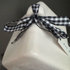 Rae Dunn three leaf clover birdhouse. Features a stylish black and white ribbon.
