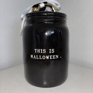 The product is a Rae Dunn Disney Jack Sally canister inspired by The Nightmare Before Christmas, featuring Jack Skellington and Sally and the phrase "This is Halloween" from the iconic Disney movie. This collectible item is part of Disney's franchise and is designed to be a unique and stylish addition to any fan's collection. The canister is branded by Disney and is a must-have for fans of the beloved movie, perfect for Halloween or year-round display.