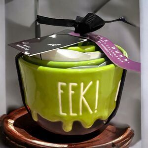 This Rae Dunn measuring cup set is perfect for any Halloween-themed kitchen. The set includes four round cups in a green and black toxic slime drip pattern, with a fun and spooky "EEK! BOO! SHRIEK!" design. The cups are made of ceramic and are dishwasher safe for easy cleaning.