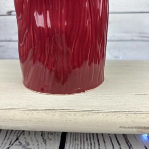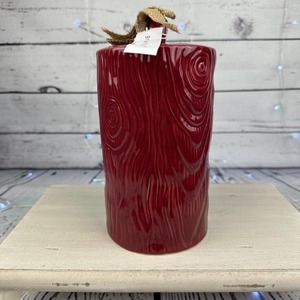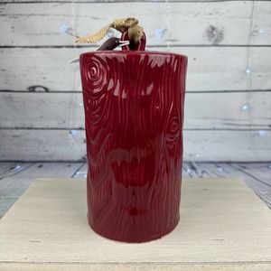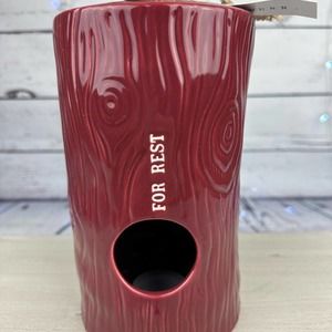 Rae Dunn For Rest burgundy Woodgrain cylinder birdhouse. This birdhouse has beautiful detail and is a perfect addition to any spring, fall, basic and neutral decor. Measures approx 9.5” tall x 4.75” wide.