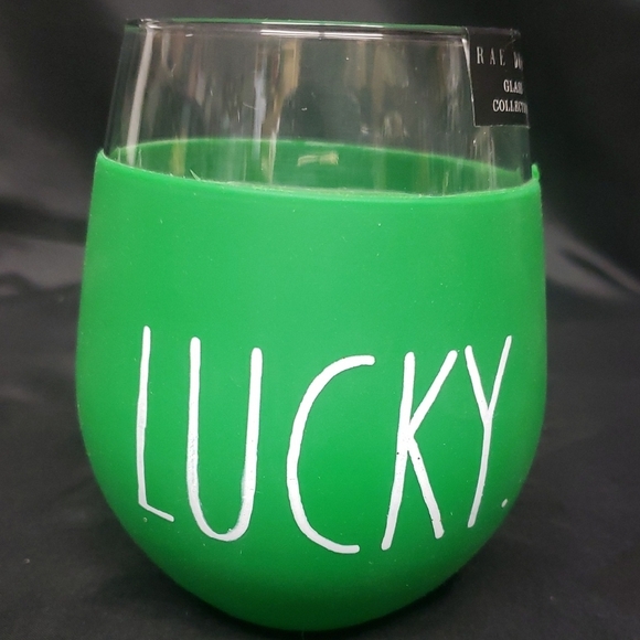 Rae Dunn NWT glass with 'Lucky' printed in white on green gripper