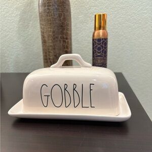 Rae Dunn by Magenta "GOBBLE" covered butter dish. White ceramic with the word "GOBBLE" in Rae Dunn's signature font.