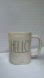 Mug is creamy white. HELLO is written in black large long letters ll.