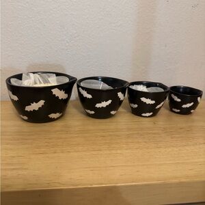 Set of black measuring cups with Bats design. Ceramic. One cup, half cup, third cup and quarter cup. Excellent condition. Used for display only.