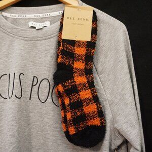 Rae Dunn 2 Piece Set. Sweatshirt. Heather Gray with “Hocus Pocus” On Front in Black. Halloween. Matching Fuzzy Socks Orange and Black Checkerboard Print. Long Sleeves. Round Neck. Polyester Blend. Women’s Size X-Large. New with Tags.