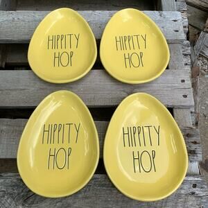 Adorable yellow egg shaped appetizer plates from Rae Dunn with “Hippity Hop” on them. New never used. Set of 4