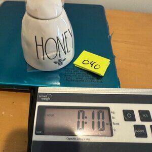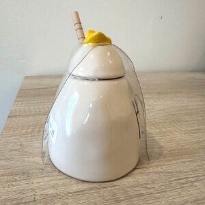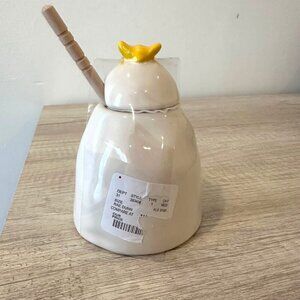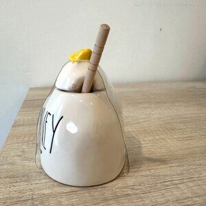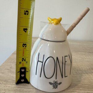 Elevate your kitchen aesthetic with this charming Rae Dunn honey jar. Its functional design includes a lid and dipper, blending style with practicality.