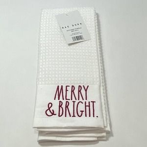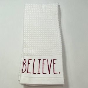 NEW Rae Dunn MERRY & BRIGHT BELIEVE White Holiday Kitchen Towel 2 pc. Set. One towel says MERRY & BRIGHT and the other towel says BELIEVE. White with red embroidered lettering.