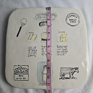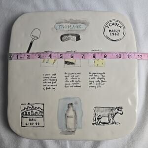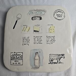 Good Condition, Rae Dunn Fromage Cheese Board, Square Platter, Ceramic with Imperfect Finish Details - Indentations On The Two Stamps, Cheese Cutter, and Cow On Front