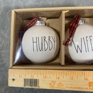 Rae Dunn Magenta Hubby Wifey Set 2 Christmas Ornaments Ceramic Balls & Ribbon