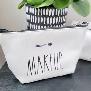 Set of two new makeup bags with tags attached, as shown. Rectangle kit is approx 10.5"x4"x4". Smaller bag is 8"x5"x2" at widest points. Smaller bag has a small dye run or smudge on one end as shown. There are minor imperfections on both bags, as typical for Rae Dunn items. Zippers are functional and smooth. Interiors are perfect. Smoke, pet, and fragrance free shop. Bundle to save on shipping! BINre032316M2 #makeup #raedunn #bags #cosmetic #organizers #homegoods #tjmaxx #blackandwhite #leather #bundle