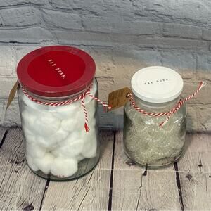 Item Specifics: Rae Dunn Merry Christmas Jar with Cotton Balls inside and Holly Jolly Jar with Hair Ties inside. The cotton balls and hair ties are sealed inside from original packaging.