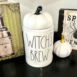 New ivory WITCH’S BREW black LL pumpkin top cauldron 2 sided Halloween candle by Rae Dunn