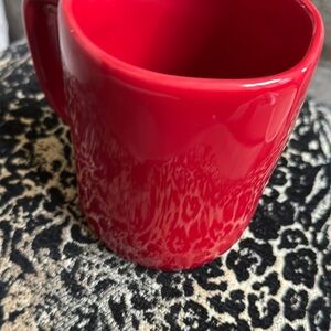 Bright red Rae Dunn mug. Ideal for festive beverages.