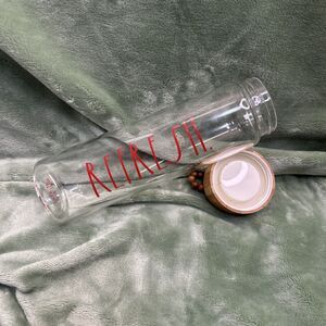 The Rae Dunn "Refresh" 20 oz clear hydration bottle with a bamboo lid and beaded handle in red lettering is a stylish and decorative water bottle perfect for all occasions. Seemingly unused.