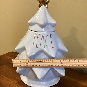 Rae Dunn Sculpted PEACE CHRISTMAS TREE CERAMIC COOKIE JAR LIGHT BLUE & GOLD