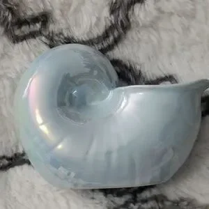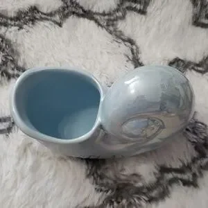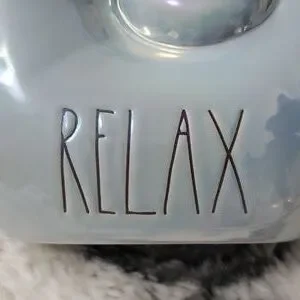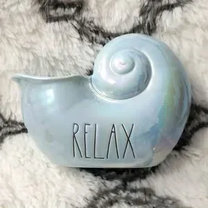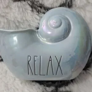 Rae Dunn ceramic shell with luster finish. Blue iridescent with black writing "Relax"