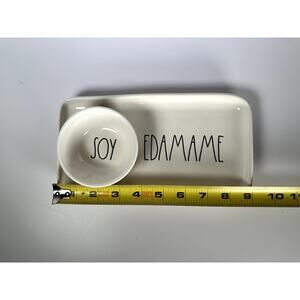 Minimal, functional Rae Dunn serveware: a rectangular plate with an attached dipping bowl labeled “Soy,” paired with “Edamame” script—perfect for sushi nights, appetizers, or grazing boards.