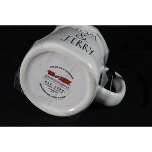 New Rae Dunn Tom & Jerry ceramic mug by Magenta. The mug has double-sided features with "TOM & JERRY" on one side, and the characters Tom and Jerry in color on the other side. The topper lid is a hammer.