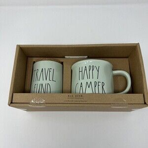 Rae Dunn Travel Fund Coin Bank Change Jar Camping/Travel Set Happy Camper Mug. new in box and unique!