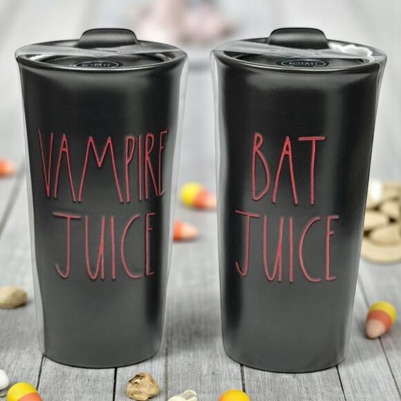 Rae Dunn Travel Mug Set Vampire Bat Juice Ceramic W/Lid Halloween New in boxes