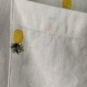 Made of 55% linen and 45% rayon. Machine wash cold, like colors, gentle cycle, tumble dry low, low iron. Care tag attached.