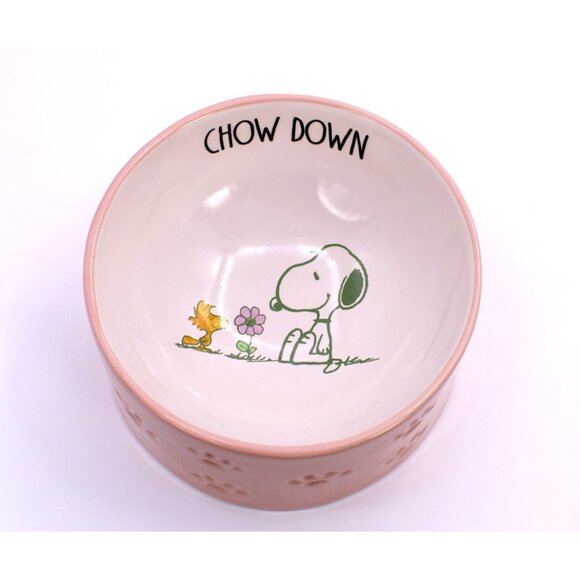 Serve Your Furry Best Friend In Style With This Super Cute Mealtime Bowl From Rae Dunn X Peanuts "Chow Down". Featuring Snoopy And Woodstock. The Bowl Is White And Pink. There Are Paw Prints All Around The Outside Of The Bowl. It Measures 5" in diameter x 2.5 tall.