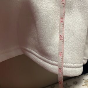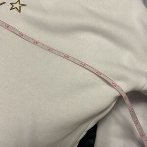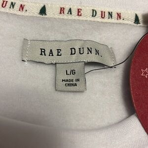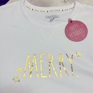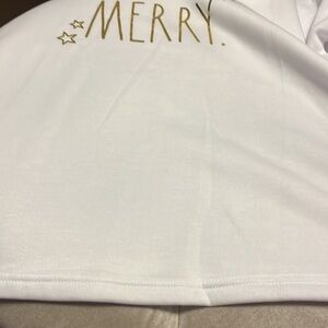 Ray Dunn white super soft and cozy lounge set. This is a mismatched set. The top is a size large and the bottoms are a size medium. That might not be a bad thing though. The top is boxy so that it is very flowy at the bottom. The inside is an incredibly soft brushed fleece. Bold letters that say Merry on the front with a few stars. The pants are a nice medium weight sweatpants in a jogger style. Drawstring waistband and pockets. Brand new.