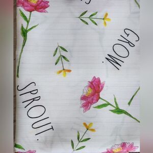 Rae Dunn white shower curtain with pink flowers and green stems. Features words like 'Grow' and 'Sprout'.