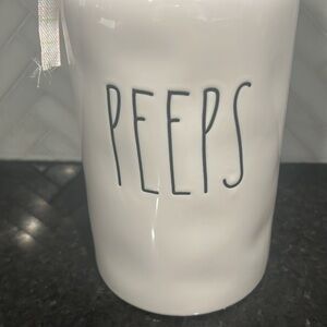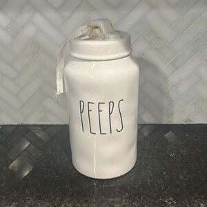 Chic white ceramic canister with 'Peeps' text. Perfect for storage or decor.