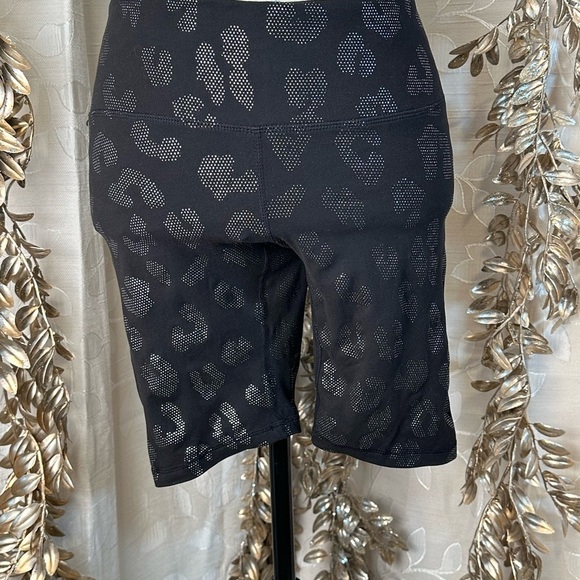 Rae Mode black leopard print biker shorts, size M. Features a high-rise fit with a stretchy, form-fitting design. Made from 82% poly microfiber, 18% spandex, and 5% polyurethane for flexibility and comfort. Subtle metallic leopard print detailing adds a stylish edge. Wide waistband for tummy control. Ideal for workouts, lounging, or casual wear.