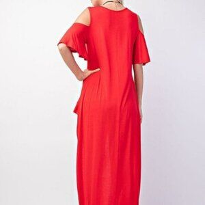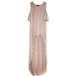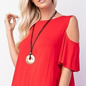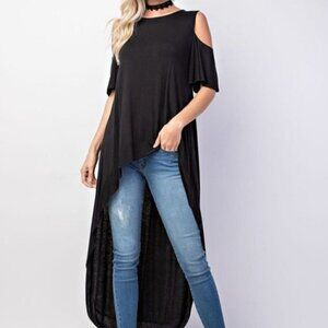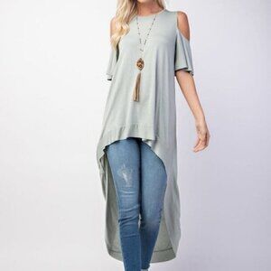 Hi Low Cold Shoulder Top in Beige Tan Neutral by Rae Mode - Pictures with models are only an example of the top in other colors. This one being sold is in moss green. 95% Viscose Modal 5% Span - Very soft and comfortable. Model is 5'10" and is wearing a size S.