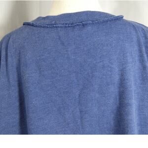 Blue distressed neckline, boxy look. A little stretch to material. Oversized.