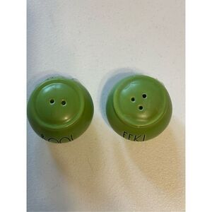 These set of Rae Dunn salt and pepper shakers add a touch of spooky fun to your Halloween table. Part of the Artisan Collection by Magenta, feature the classic Rae Dunn font with the words "BOO!" on one and "EEK!" on the other. The shakers are a vibrant green color and have a simple, rounded design. Perfect for Halloween parties or adding a festive touch to your everyday meals during the spooky season.