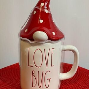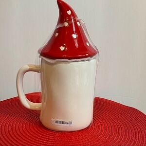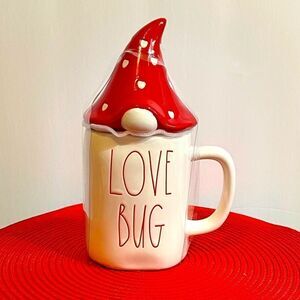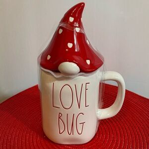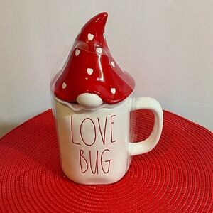 ◦ White Mug with Rae Dunn signature writing in Red & topper in Red with white hearts