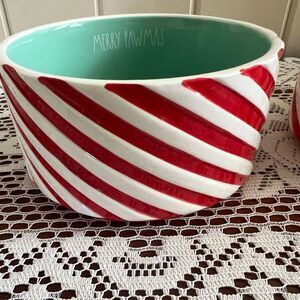 This listing is for a set of two NWT's Rae Dunn Merry Pawmas animal bowls. The outside of the bowls are red/white candy cane stripe, green on the inside. Each bowl is approximately 6.5 x 3.5.